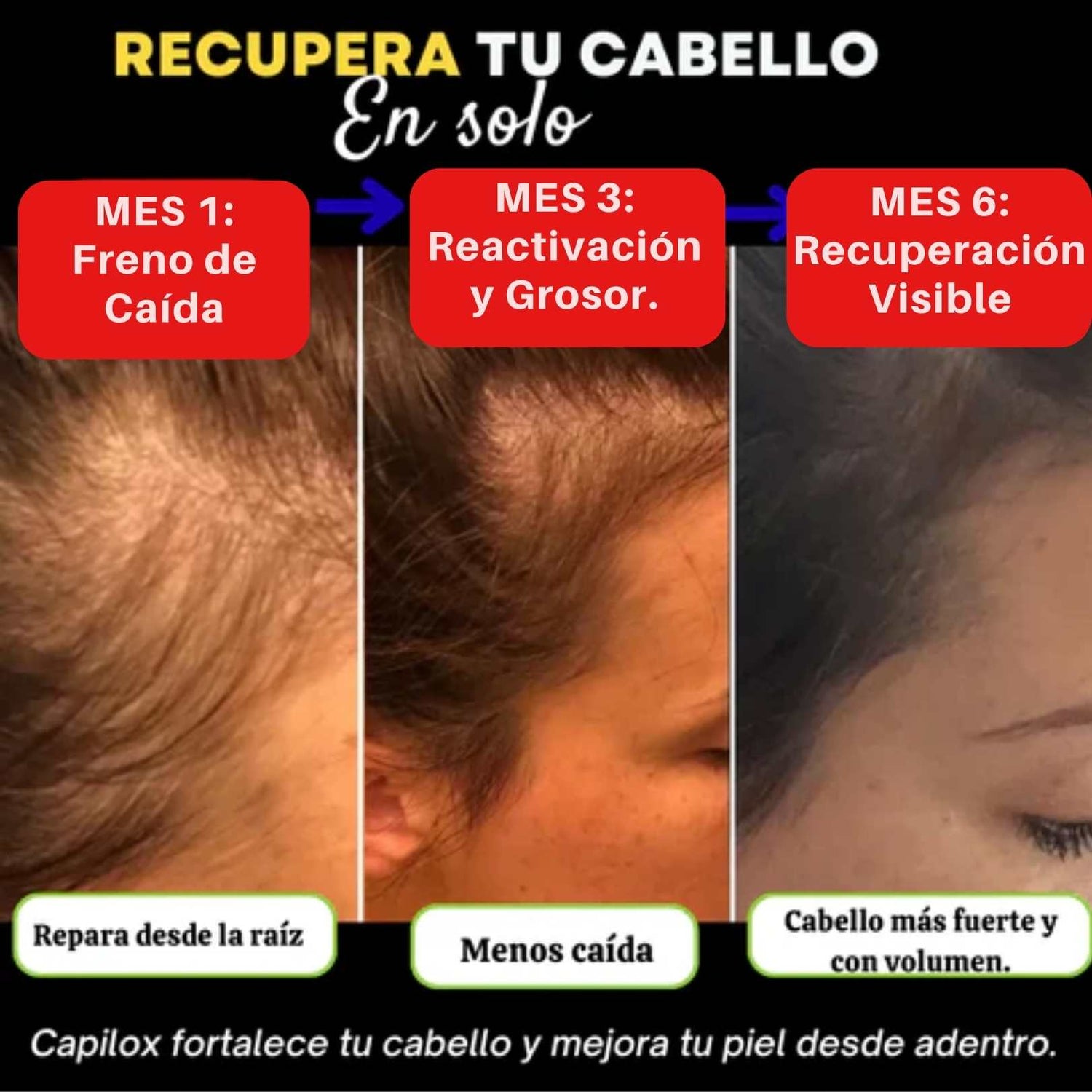 La constancia paga. Mes 1: Se detiene la caída excesiva. Mes 3: El cabello se siente más grueso y con volumen. Mes 6: Recuperación visible de zonas claras.